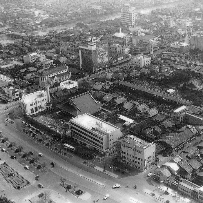 1960年(昭和35年)頃 市役所前の航空写真 まだ車もまばらで穏やかな1コマです
